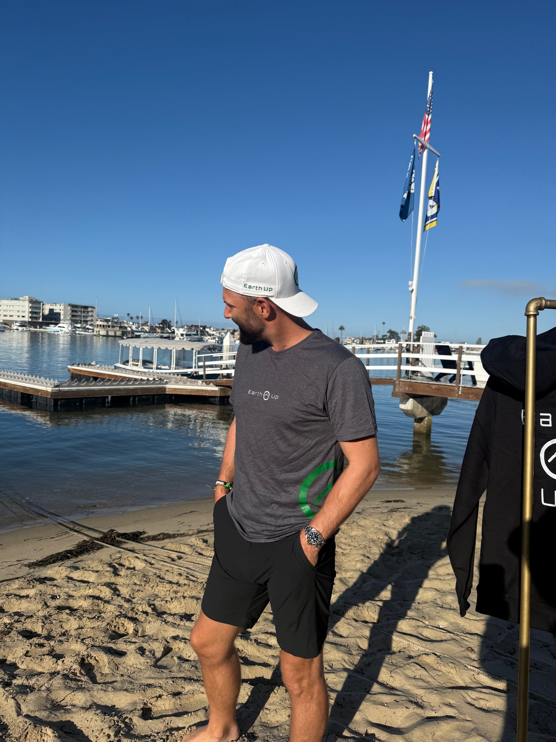 This unisex charcoal gray graphic tee combines comfort and performance with its polyester-cotton blend fabric, offering quick-drying and sweat-wicking properties ideal for active lifestyles. The soft, thin material ensures breathable wear while the professionally screen-printed EarthUp logo on the front and green side hit circle logo add a distinctive, polished look. Perfect for those who demand both style and function in their daily basics.